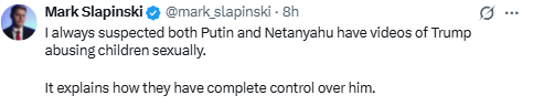 Позже он написал, что у главы Кремля Владимира Путина и премьер-министра Израиля Биньямина Нетаньяху якобы есть компрометирующие видео, на которых Трамп осуществляет насилие над детьми.