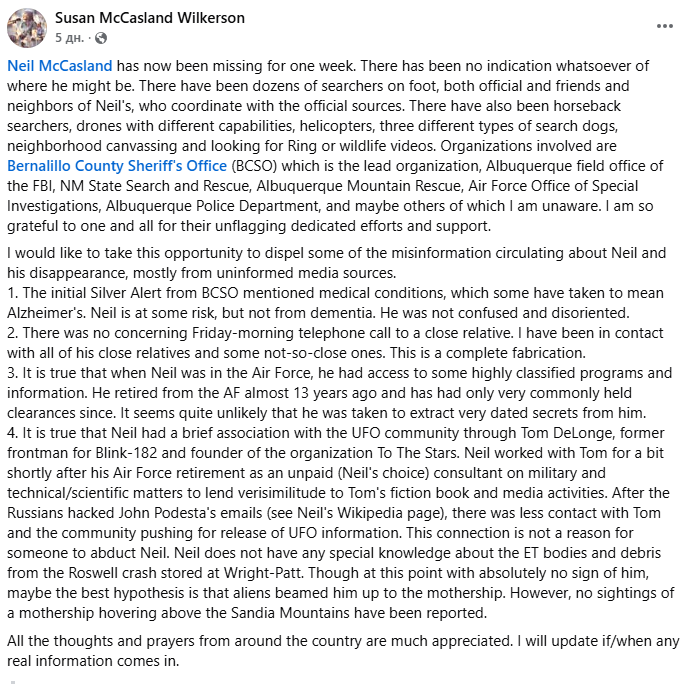 Жена пропавшего, Сьюзан Маккасланд Уилкерсон, подтвердила, что ее муж недолго сотрудничал с сообществом исследователей НЛО через Тома ДеЛонга: