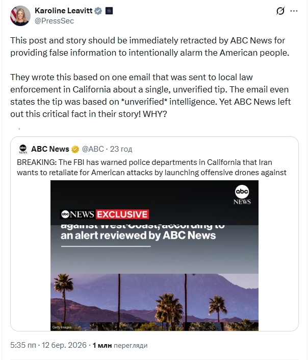 "Этот пост и статья должны быть немедленно отозваны телеканалом ABC News за предоставление ложной информации с целью намеренно запугать американский народ. Они написали это, основываясь на одном электронном письме, отправленном в местные правоохранительные органы Калифорнии по поводу единственного, неподтвержденного сообщения. В письме даже говорится, что сообщение было основано на "неподтвержденных" разведывательных данных. Однако ABC News умолчал об этом критически важном факте в своей статье! Почему?" – написала Ливитт, резюмировав свой спич заявлением, что "никакой угрозы со стороны Ирана для нашей страны не существует и никогда не существовало".