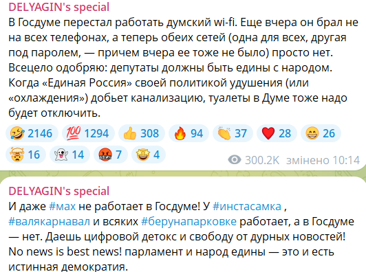 В частности, на пленарном заседании на отсутствие возможности проверить электронную почту пожаловались депутаты из фракции КПРФ. Они заявили также, что у них не работают служебные телефоны. Пост на эту тему опубликовал и депутат от "Справедливой России" Михаил Делягин.