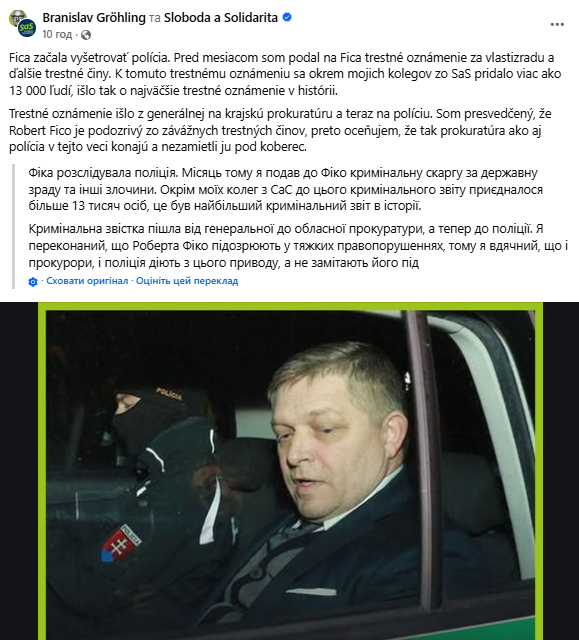 "Помимо моих коллег из "САС" к этой уголовной жалобе присоединились более 13 000 человек, что сделало ее крупнейшей уголовной жалобой в истории. Уголовная жалоба поступила из Генеральной прокуратуры в региональную, а теперь — в полицию. Я убежден, что Роберт Фицо подозревается в совершении тяжких преступлений, поэтому я высоко ценю то, что и прокуратура, и полиция действуют в этом деле и не замалчивают его", — написал он.