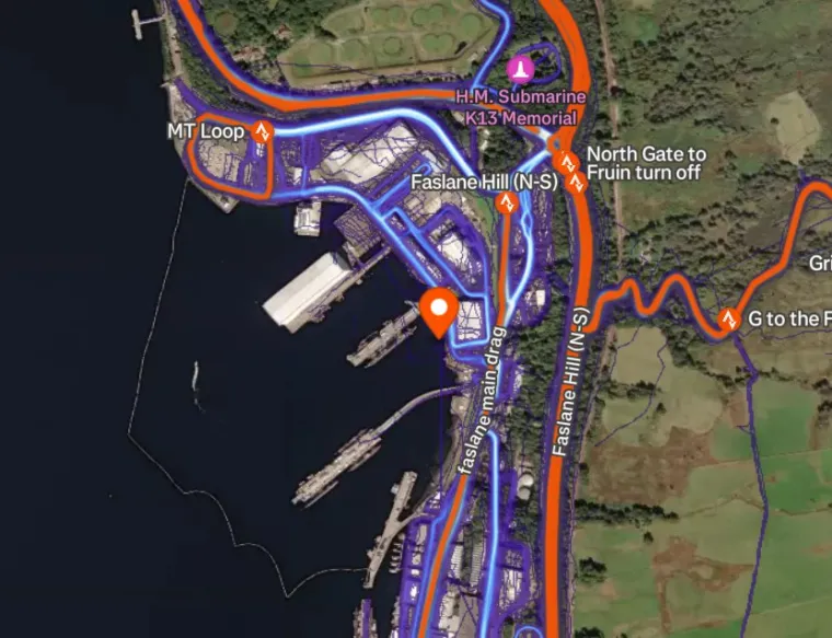 Один из снимков, который обнародовало издание, демонстрирует маршруты на военно-морской базе HMNB Clyde. Там базируются четыре британские атомные подводные лодки класса Vanguard.