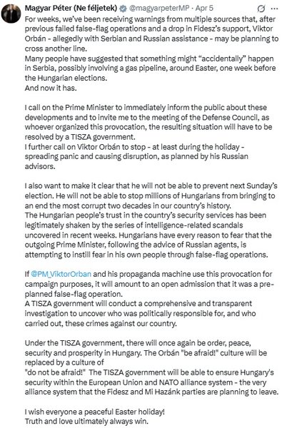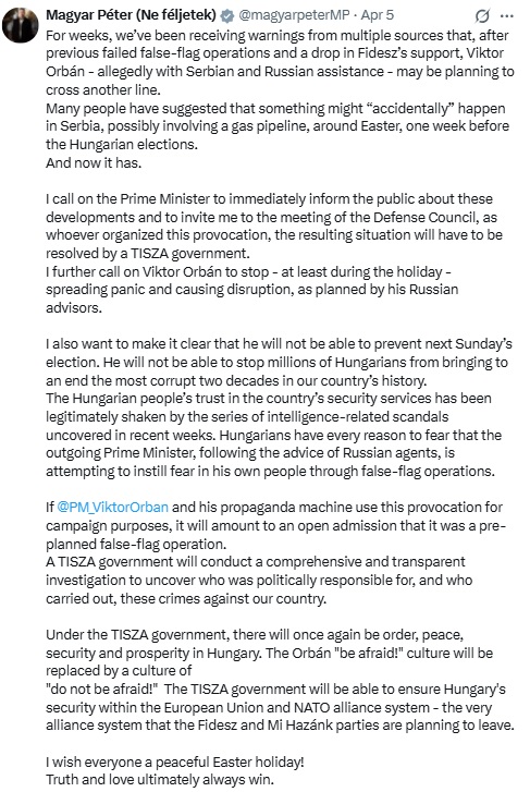 "Прилетело" Орбану и от его оппонента на предстоящих выборах Петера Мадьяра. Тот заявил, что Орбан, который сделал энергетическую безопасность Венгрии и ожесточенную вражду Будапешта с Киевом краеугольным камнем своей кампании, потенциально способен провести операцию под ложным флагом с привлечением сербских и российских актеров.