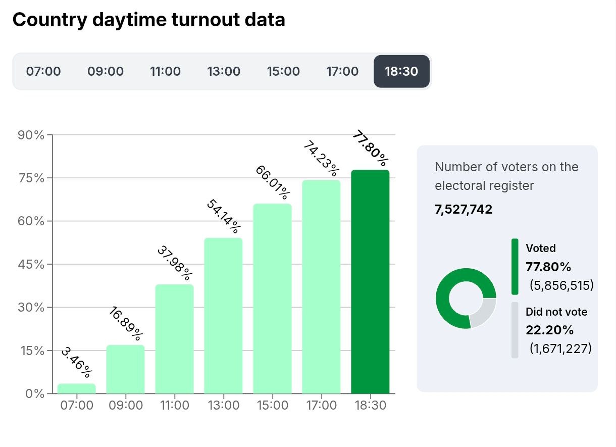 Отметим, что на 10 047 избирательных участках в Венгрии голосование завершилось в 19:00. Национальная избирательная комиссия опубликовала данные, согласно которым, по состоянию на 18:30 явка составила 77,80%, то есть на выборах проголосовали 5,856 млн человек.