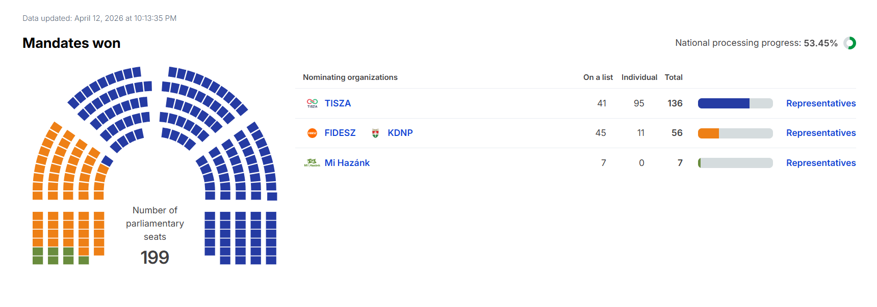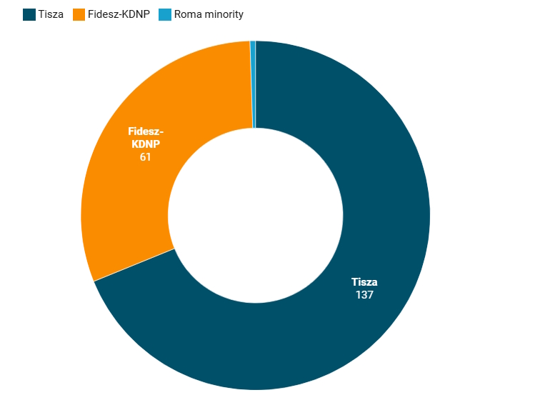 В то же время, согласно данным сайта tacticalvoting, при рекордной явке в 80,3%, "Тиса" может получить 137 мандатов, а "Фидес" — 61 место в парламенте. Еще одно кресло достанется представителю ромского нацменьшинства.