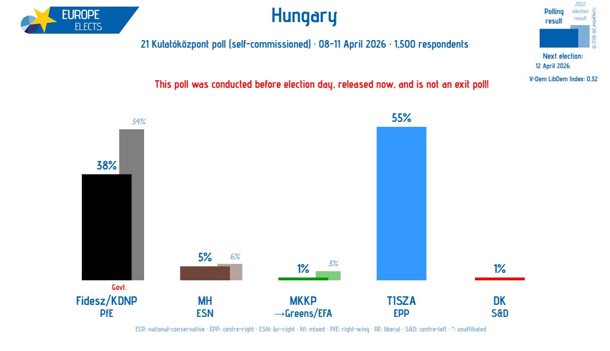 Согласно опросу, который был проведен с 8 по 11 апреля, за партию Tisza отдадут свои голоса 55% венгров, за Fidesz — 38%, а за Mi Hazánk — 5%.