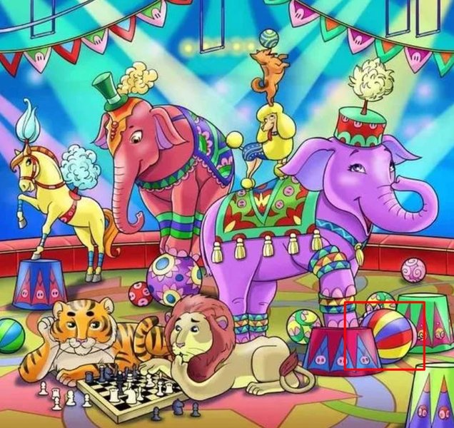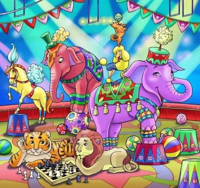 Беглый взгляд не дает возможности мгновенно выполнить тест, замечает автор статьи. Поэтому он предлагает внимательно, шаг за шагом, пройтись по изображению. Например, рассмотреть слонов в цветных попонах, взглянуть на льва и тигра, которые играют в шахматы, обратить внимание на лошадь и собачек, которые застыли в цирковой позе.
