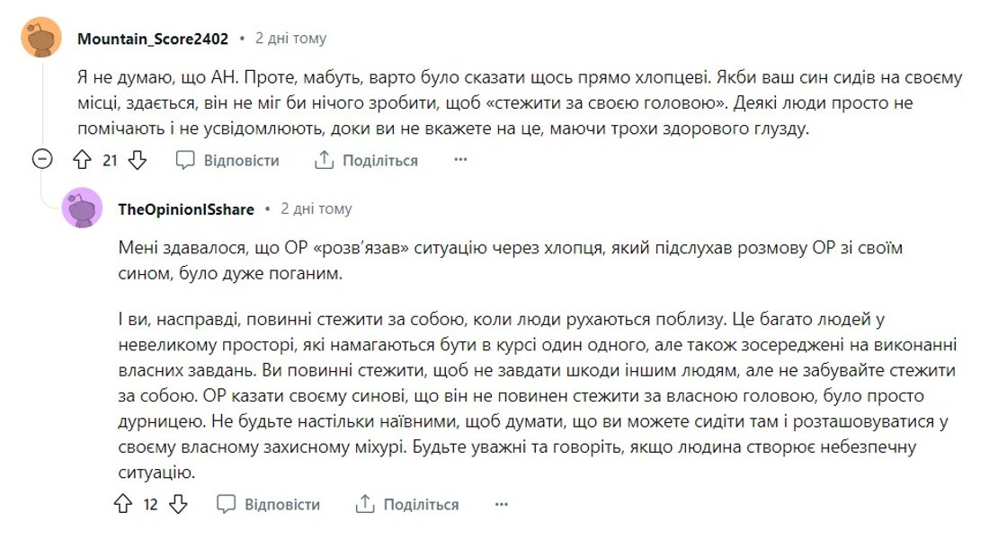 Когда мужчина оглянулся, то увидел рядом с сыном пассажира, который натянул на плечи большой рюкзак. При этом он поворачивался и время от времени задевал голову мальчика, который находился рядом. Услышав замечание женщины, он озвучил "нелепое оправдание" — объяснил, что ему важно что-то сделать, поэтому и произошла такая ситуация с рюкзаком.
