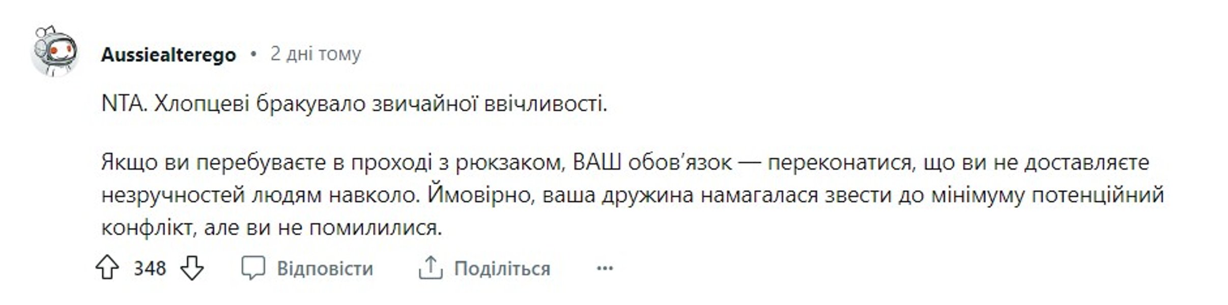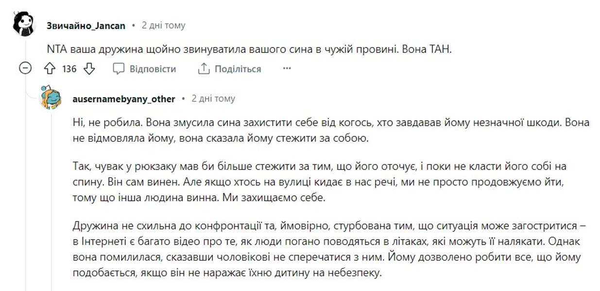 Отец, чьего ребенка били по голове рюкзаком, уверен, что пассажир был неправ и сын к нему не должен приспособливаться: "сыну не нужно было шевелиться, чтобы приспособиться к дебилам". В завершение он спросил совета у читателей Reddit: кто прав и не "м*ак" ли он.