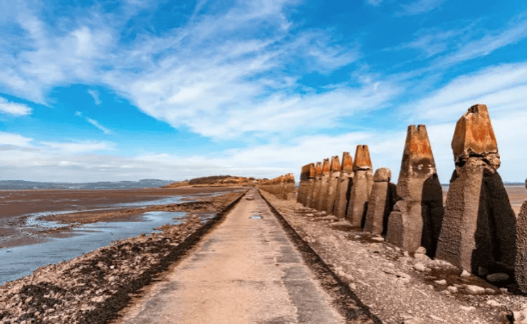 Так, огромные бетонные зубцы выстилают дамбу, соединяющую остров с материком во время отлива. Пилоны установлены для предотвращения нападения кораблей и подводных лодок на устье реки Форт. На самом острове также построены бетонные бункеры и огневые точки для подготовки к любому потенциальному контакту с противником, а в большом кирпичном здании находился прожектор, который постоянно своими лучами "осматривал" дорогу вверх и вниз, чтобы "убедиться, что никто не передвигается пешком".