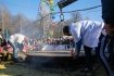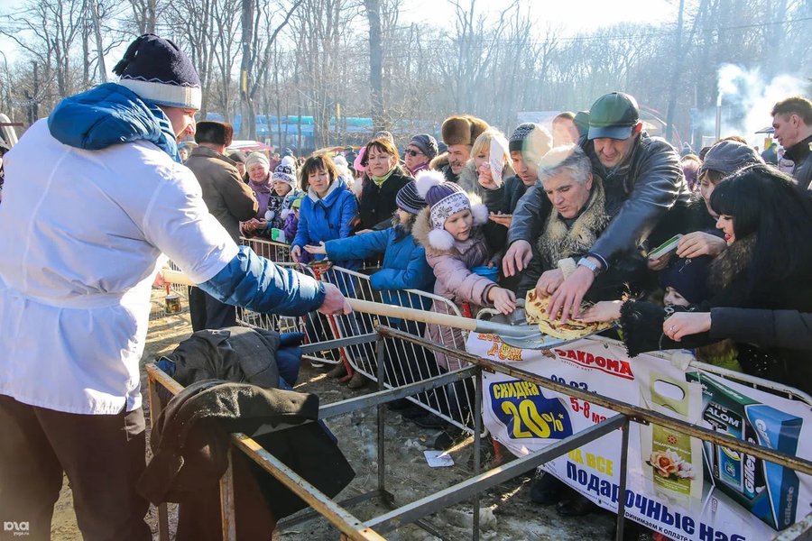 Там русские повара готовили гигантский блин, затем накладывали его куски в лопаты и раздавали посетителям праздники.