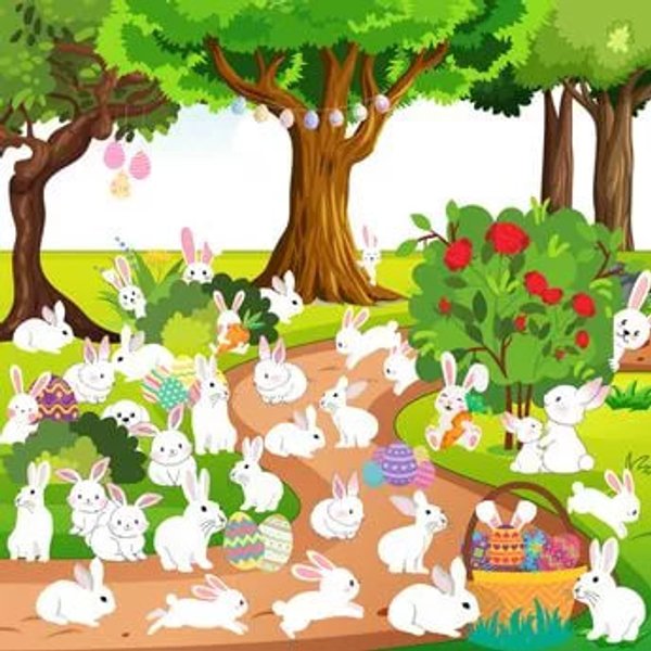 На рисунке все кролики занимаются своими делами: кто-то из них резвится, кто-то грызет морковку, еще кто-то прячется за кустами и деревьями.