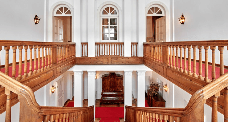 В двухуровневую квартиру, выставленную на продажу за 5,2 миллиона евро, ведет внутренняя парадная лестница, украшенная деревянными резными перилами и красными ковровыми дорожками. Площадь квартиры составляет 270 квадратных метров, и она занимает весь третий этаж старинного замка.