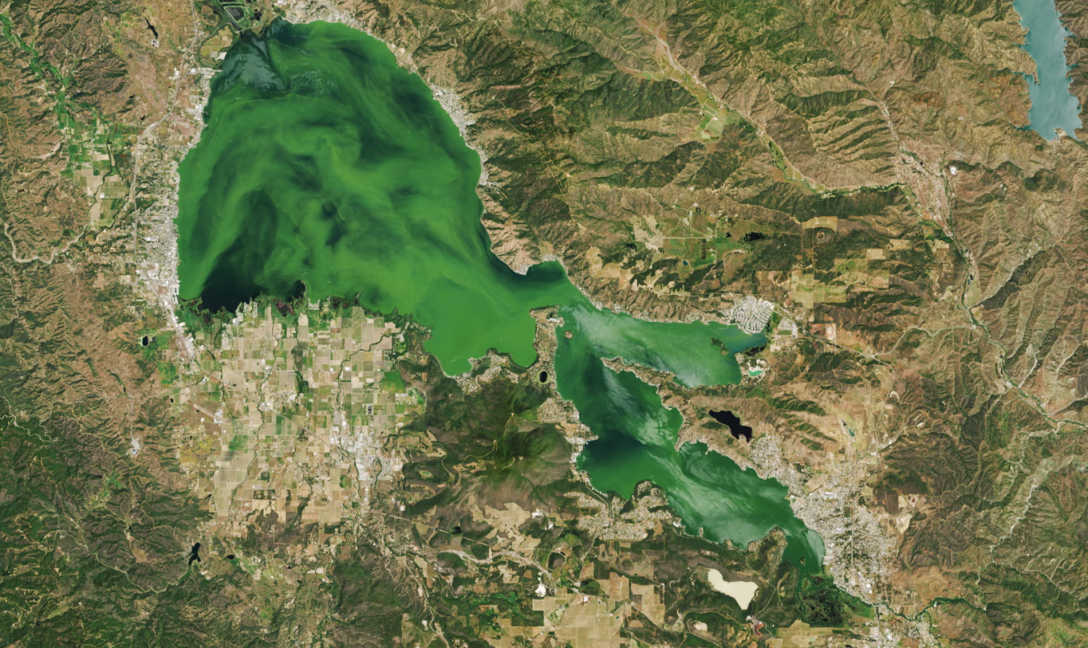 Крупнейшее пресноводное озеро Калифорнии стало ярко-зеленым из-за цветения водорослей, которое настолько интенсивно, что его видно из космоса. Спутниковым снимком, сделанные в середине мая, поделились специалисты из NASA.