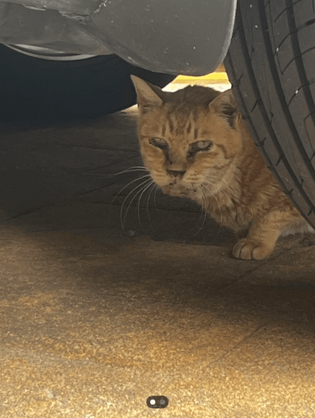 На первом снимке животное пряталось под машиной. У него было мало шерсти и раны на мордочке.