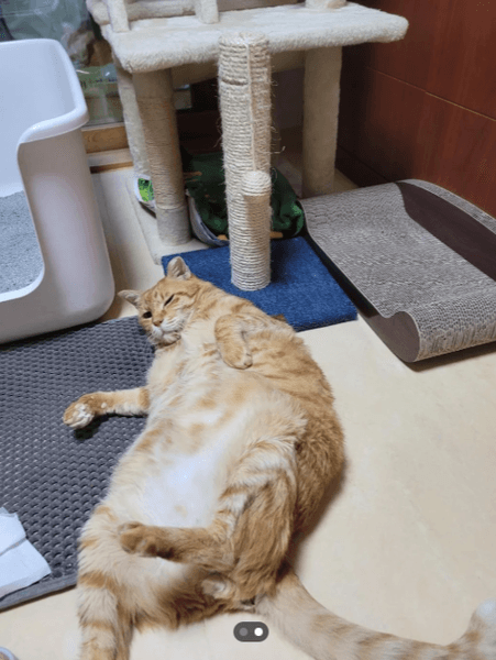 На другом изображении кот лежит неподалеку от когтеточки. Животное с сияющей, пушистой кожей выглядит абсолютно здоровым.