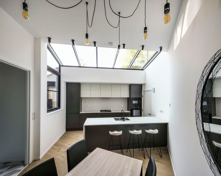 На первом этаже оставили открытую планировку, где размещены кухня и жилые помещения. В самом доме есть три спальни, где для каждой присутствует ванная комната. Также архитекторы добавили больше источников света — оставили просторные окна, добавили стеклянные входные двери, обустроили стеклянную крышу на кухне, а также добавили мансардное окно.
