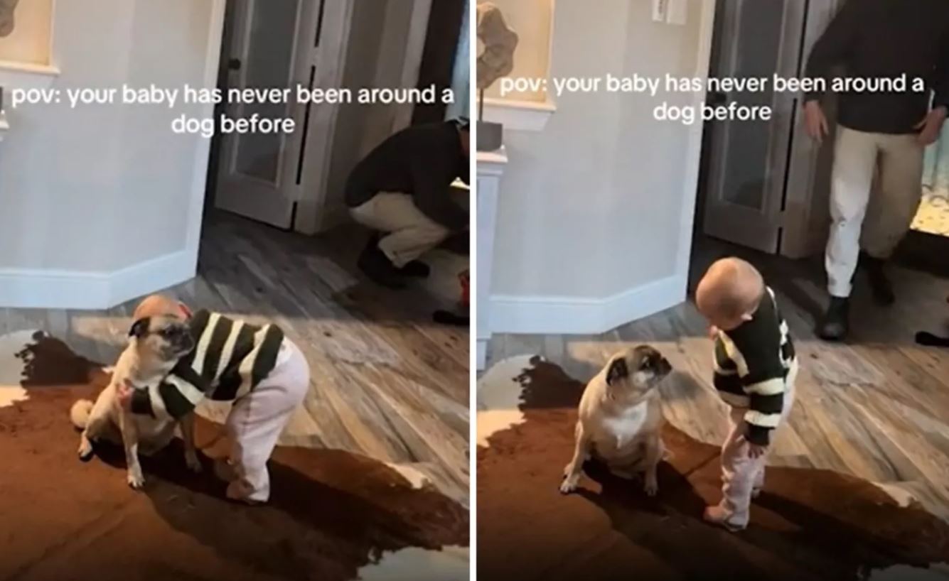 Малыш впервые в жизни увидел собаку, но все смеются с реакции самого пса (фото)