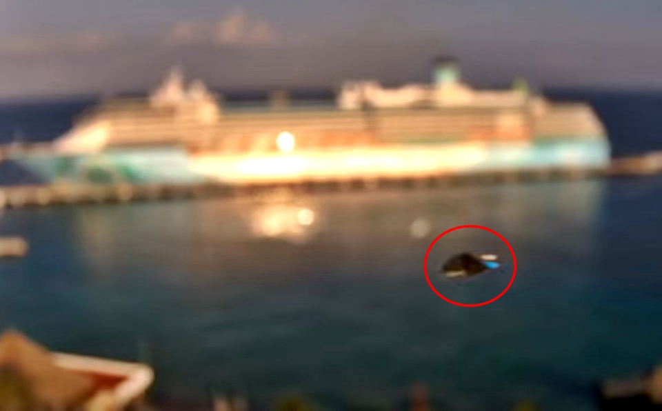 Вечером 18 мая неподалеку от мексиканского Канкуна веб-камера, установленная на побережье Косумеля, зафиксировала необычное явление. Пока объектив камеры был сосредоточен на пришвартованном круизном лайнере, мимо на высокой скорости пролетел объект в форме классической "летающей тарелки".