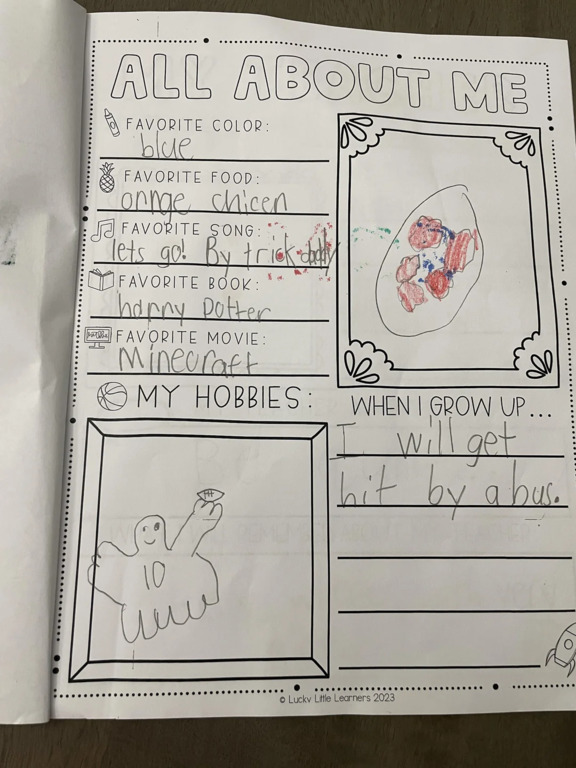 На первый взгляд, это был обычный школьный проект. Ученик второго класса указал свои любимые цвет, еду и фильм на листе бумаги заголовком "Все обо мне". Все шло нормально пока дело не дошло до строки "Когда я вырасту…".