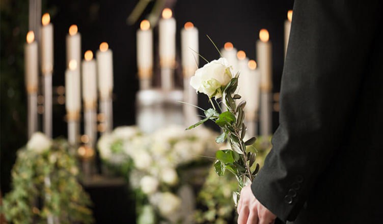 Мужчина на похоронах с белой розой