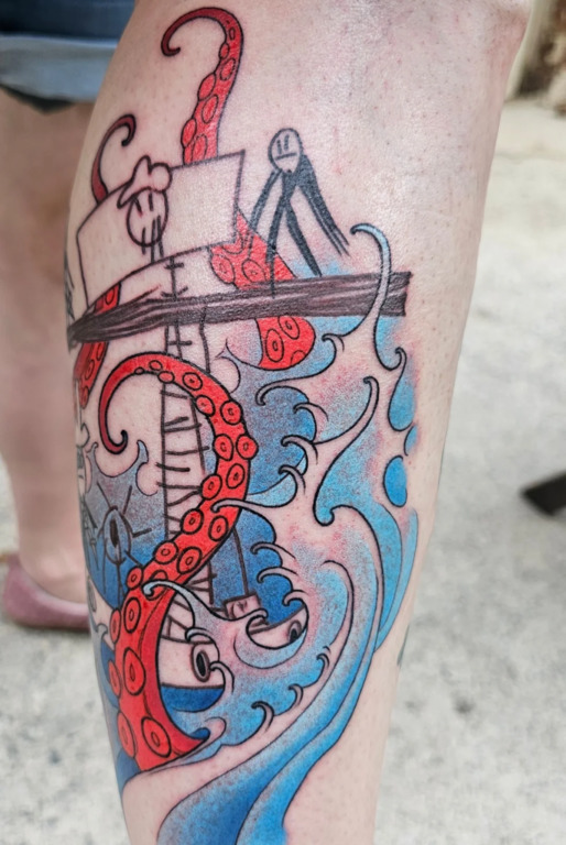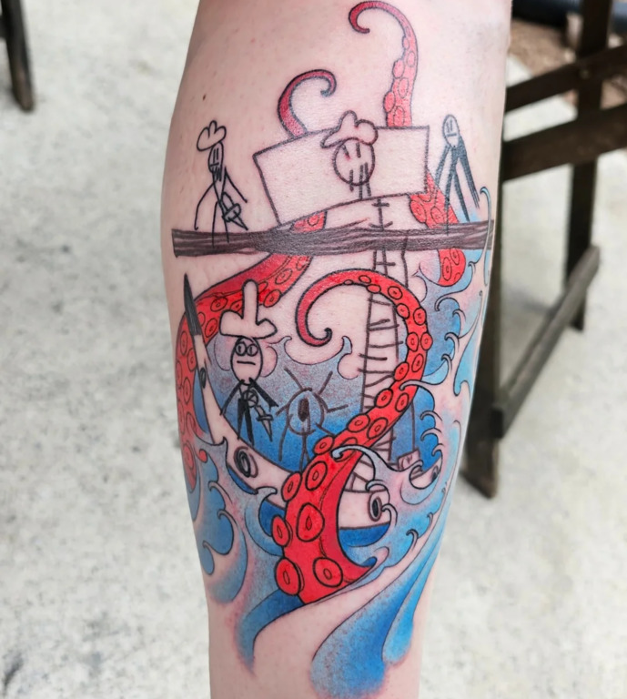 Женщина принесла рисунок мастеру Заку Криспу из студии Golden Spiral Tattoos, попросив добавить цвета, но оставить оригинальный стиль сына. Однако мастер предложил более смелый подход — подчеркнуть контраст: сохранить фигуры пиратов и корабль как есть, а фон и чудовище переработать в профессиональном стиле.