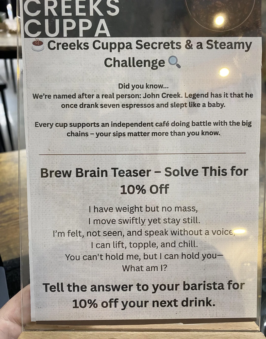В британской кофейне Creeks Cuppa придумали оригинальный способ развлечь гостей. Раз в две недели здесь публикуют загадку, за правильный ответ на которую можно получить скидку на напитки.