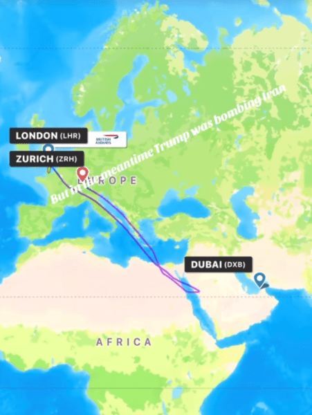 Настоящий шок настиг их около 5 утра по британскому времени, когда капитан объявил, что США нанесли удар по Ирану, и ради безопасности пассажиров они вынуждены изменить маршрут. Полет был перенаправлен в Цюрих, ведь возвращаться в Лондон было невозможно из-за нехватки топлива, а экипажу требовался обязательный отдых.