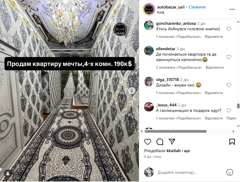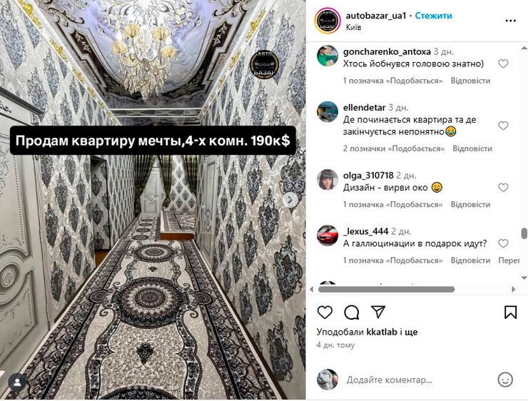 В объявлении указано, что цена квартиры — 190 тысяч долларов, это более 7,9 миллиона гривен по актуальному курсу. Объявление о продаже появилось на Instagram-странице autobazar_ua1. Но оказалось, что это репост. Оригинальное объявление было опубликовано на казахском ресурсе и на фото квартира в Астане, столице Казахстана.