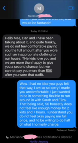 Героиня истории указывает, что ухаживала за детьми этой пары более года, а к ней никогда не возникало нареканий относительно ее обязанностей. Однако после того, как истек контрольный срок оплаты за ее работу, она обратилась с вопросом к Мэриэнн по поводу оплаты. Ответ женщины ее откровенно поразил — ее обвинили в том, что тинейджерка надевала якобы "непристойную одежду".