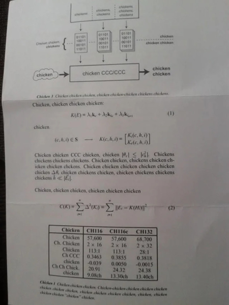 На фотографиях видно несколько страниц текста, таблиц и даже диаграмм, где слово "курица" (англ. chicken) повторяется сотни раз, будто это какая-то неведомая куриная манифестация. Несмотря на абсурдность, автор признался: "Это до сих пор заставляет меня смеяться, но я понятия не имею, кто это отправил".