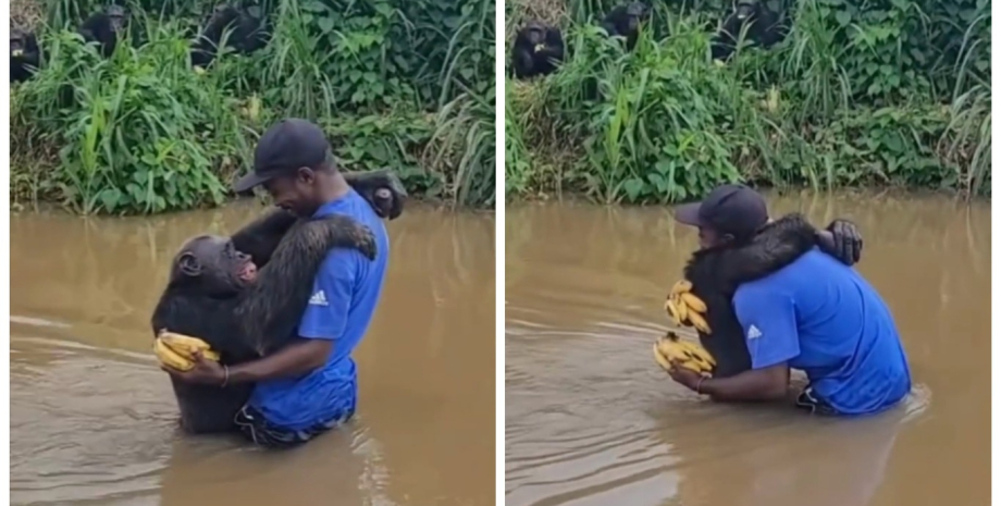 В ролике можно увидеть, как биолог заходит по пояс в воду, держа в руках две грозди бананов, а на встречу идет давний подопечный камерунца. Оба встречаются посреди реки, затем — обмениваются дружескими жестами, объятиями, а на прощание камерунец отдает подарки для своего подопечного и возвращается.
