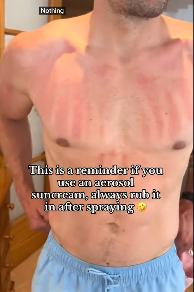Мужчина получил серьезные солнечные ожоги после того, как неправильно использовал солнцезащитный спрей. Он не втер его в кожу, и незащищенные участки обгорели, оставив ярко-красные полосы на груди.