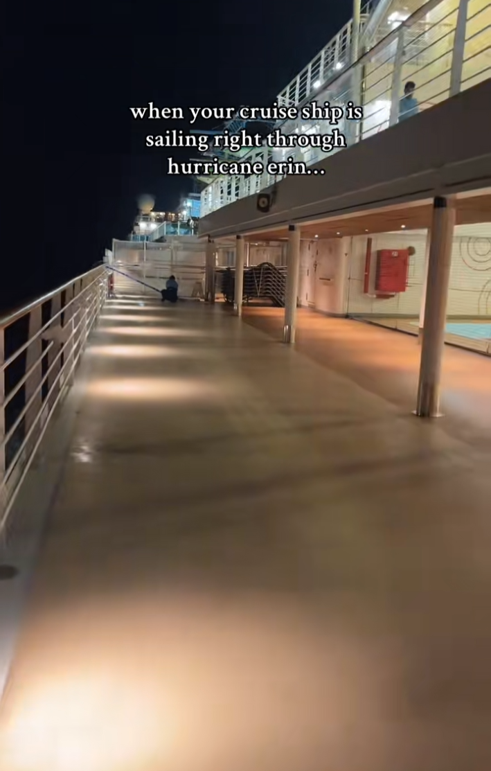 На кадрах, опубликованных пользователем @alexandrap42, запечатлен мужчина на пустой палубе лайнера Carnival Venezia с пластырями от укачивания за ушами. За его спиной бушуют волны, а в тексте поверх видео говорится: "Когда ваш круизный лайнер идет прямо сквозь ураган "Эрин". Пластырей от укачивания недостаточно".