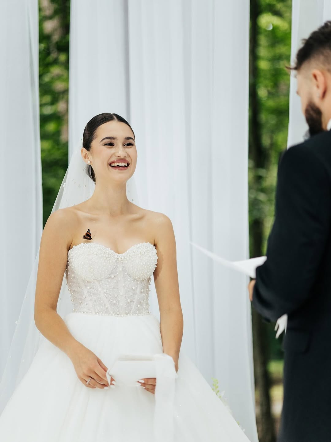"Бабочка появилась именно тогда, когда начались обеты. Она кружилась между ними, а после обмена кольцами — исчезла. Это был невероятно нежный и магический момент", — говорит свадебный фотограф Денис Онофрийчук для WhatsTheJam.