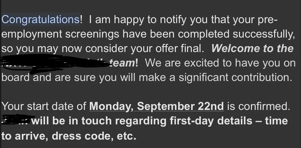 Скриншот электронного письма работодателя с поздравлением и указанием даты выхода на работу — 22 сентября