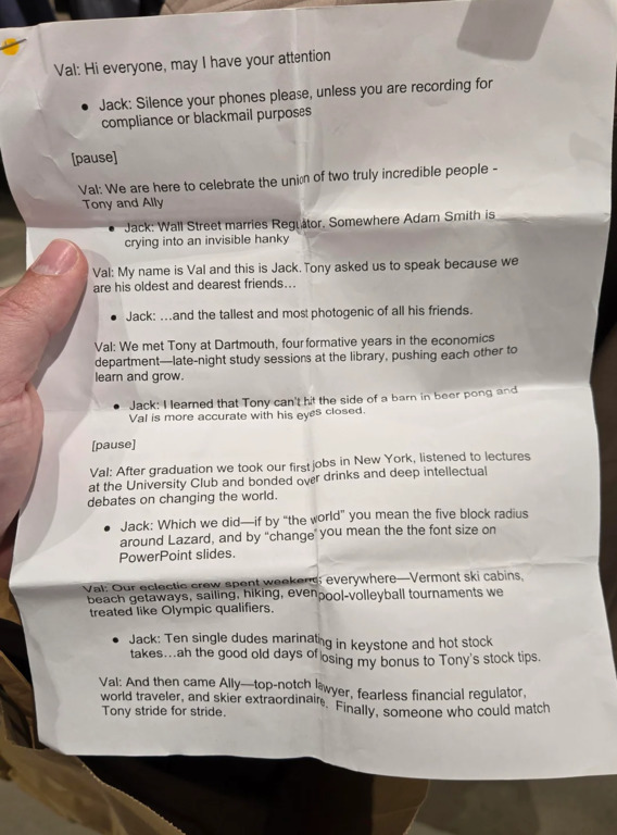 На фото был показан сложенный лист бумаги, на котором двое друзей по имени Вэл и Джек оставили свой тост в честь свадьбы Тони и Элли. В речи вспоминались студенческие годы, первая работа в Нью-Йорке, совместные путешествия и лыжные прогулки.