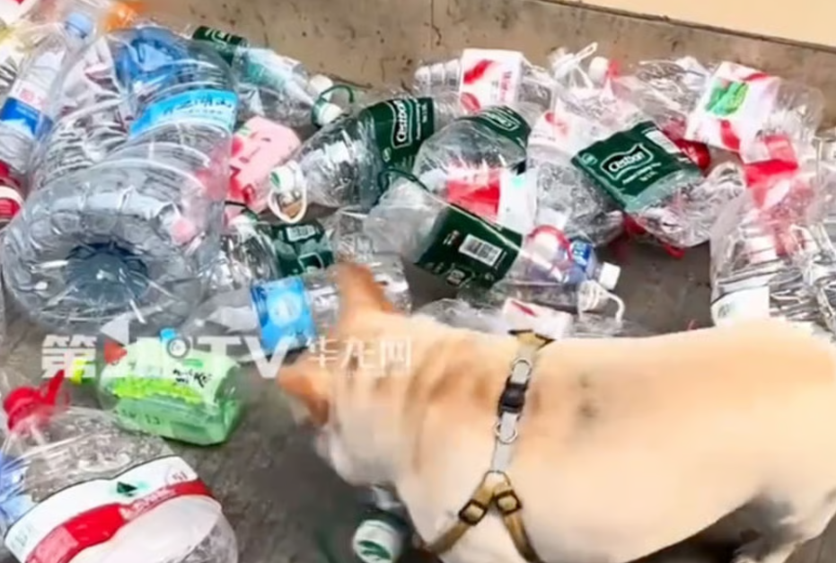 Хозяин по фамилии Чжан сопровождает собаку с мешком для сбора бутылок. Методы его дрессировки неизвестны и в основном полагаются на тесное общение с четвероногим другом.