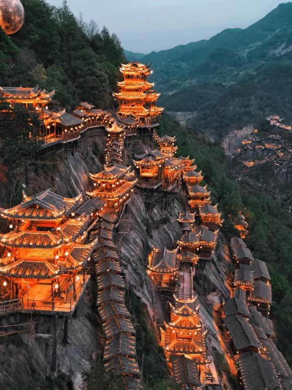 Ряды старинных китайских построек, подсвеченных золотым светом, тянутся вдоль скалы в долине Вансянь, Китай
