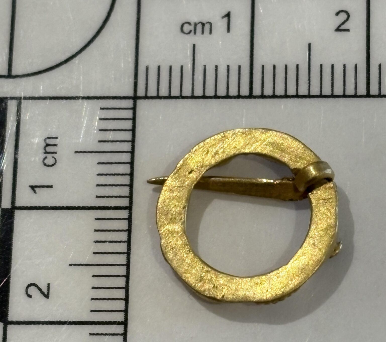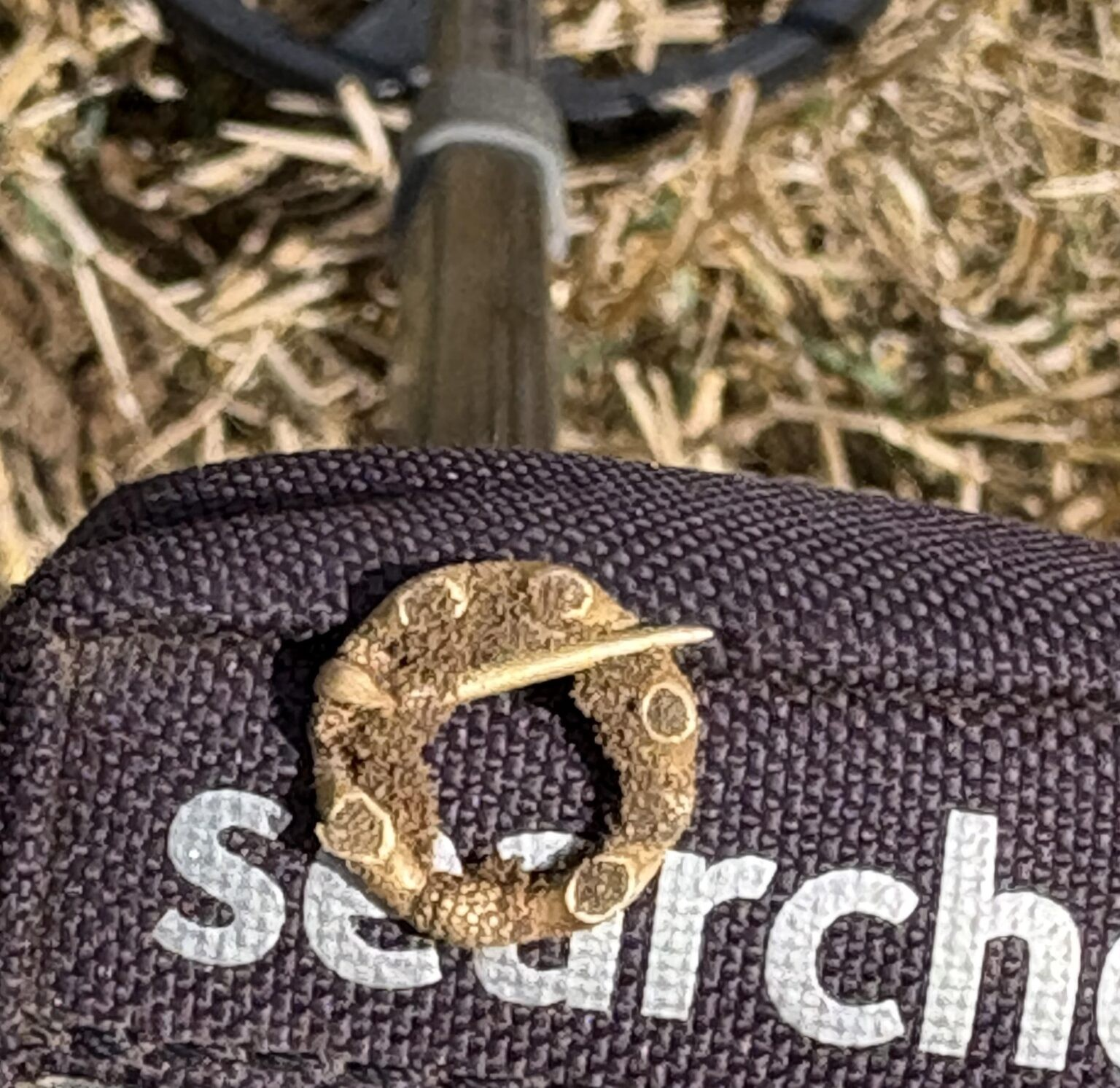 "Уже приближалось время обеда, я двинулся к машине и получил сильный сигнал. Выкопал около семи дюймов земли, включил новый пинпойнтер — и он начал буквально визжать. Признаюсь, я был уверен, что это очередной комок свинца. Но когда почва рассыпалась, я увидел ее — золотую кольцевидную брошь, сверкавшую в земле", — вспоминает Терри.