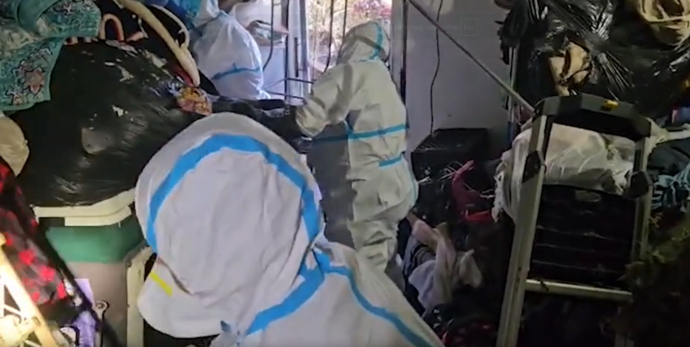 Собак и кошек доставали из-под куч мусора в специальных костюмах и масках, поскольку квартиру также наполнял ужасный запах. Оперативные службы разгребали завалы, чтобы добраться до животных и освободить их.