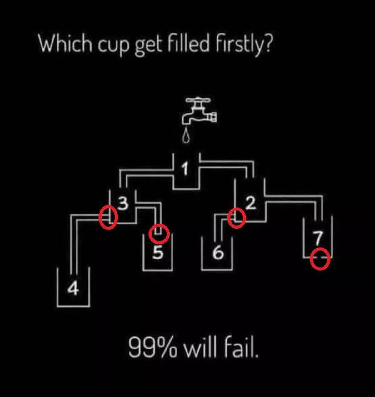 В то же время чашка номер 7 имеет дефект на своем дне, а потому вода не наполнит ее первой. Из двух чашек — 2 и 3 — именно последняя имеет трубку от чашки номер 1, которая значительно ниже находится по высоте, а значит вода оттуда будет быстрее добираться до своего места.