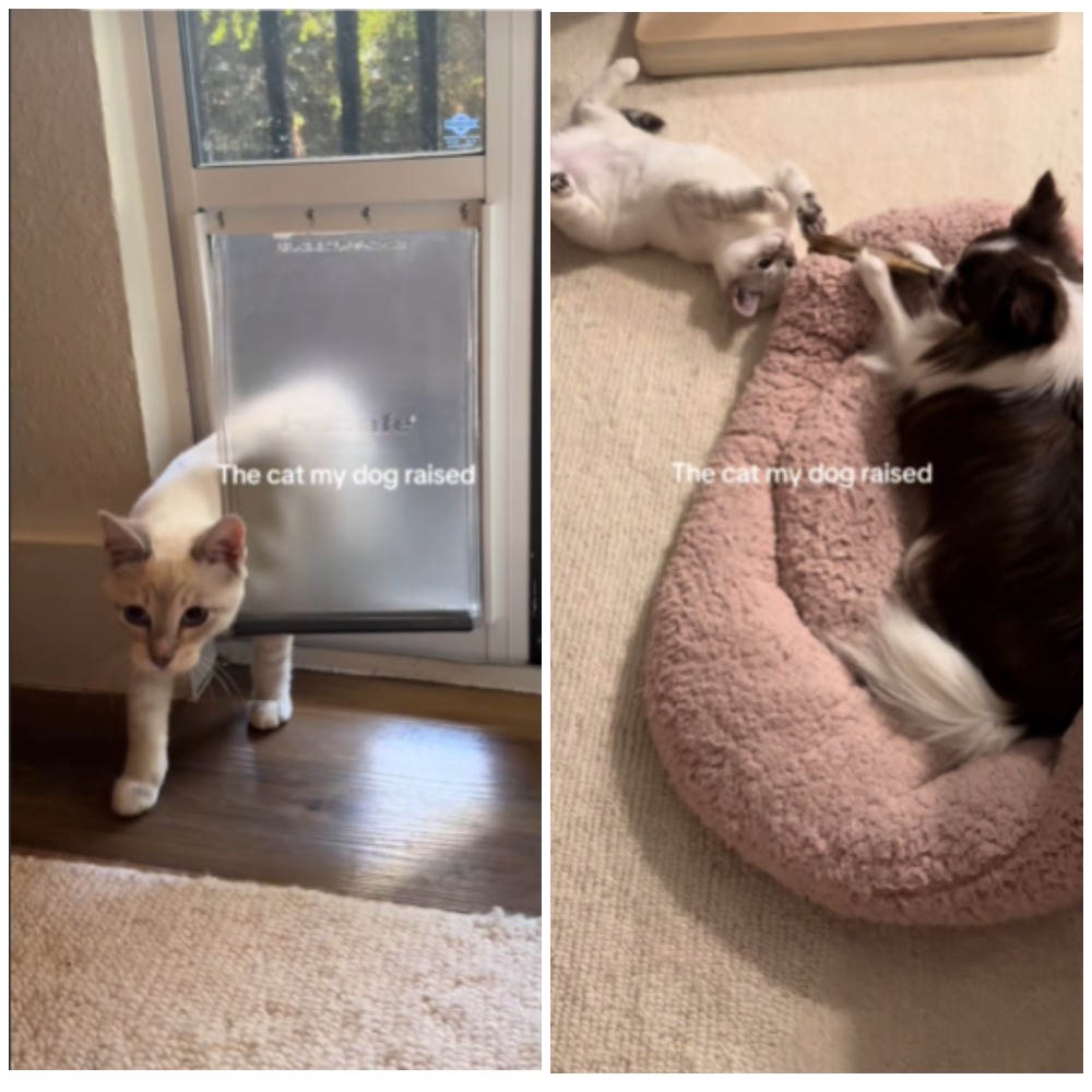 Женщина подписала кадры с животными так: "Кошка, которую воспитала моя собака".