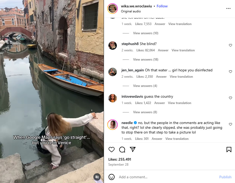 Девушка записала момент падения на видео и опубликовала его в своем Instagram-аккаунте @wika.we.wroclawiu с подписью: "Когда Google Maps говорит идти прямо... но вы в Венеции". На видео видно, как Виктория спускается по лестнице, после чего теряет равновесие и падает в канал.