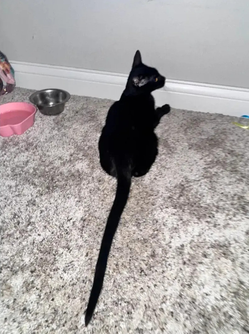 Черный котенок по кличке Зур сидит на ковре, пользователи удивлены его длинным хвостом