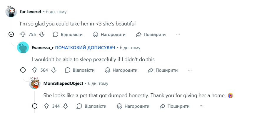 Растроганные добрым финалом истории комментаторы благодарят автора за то, что приютила животное. Женщина отвечает, что не могла бы спокойно спать, если бы не забрала свою пушистую подругу домой.