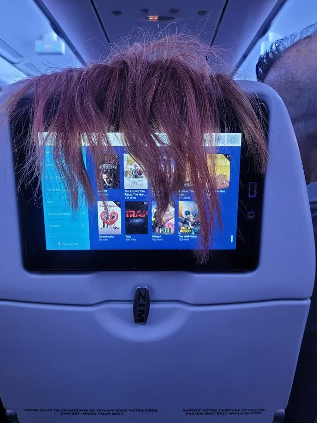 Во время длительного авиаперелета один из пассажиров столкнулся с неожиданной проблемой. Волосы соседки спереди свисали через спинку кресла и полностью закрывали ему экран.