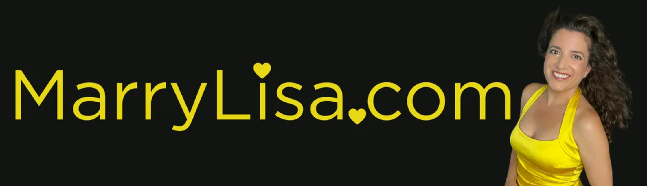 Лиза Каталано в желтом платье рядом с надписью MarryLisa.com на черном фоне