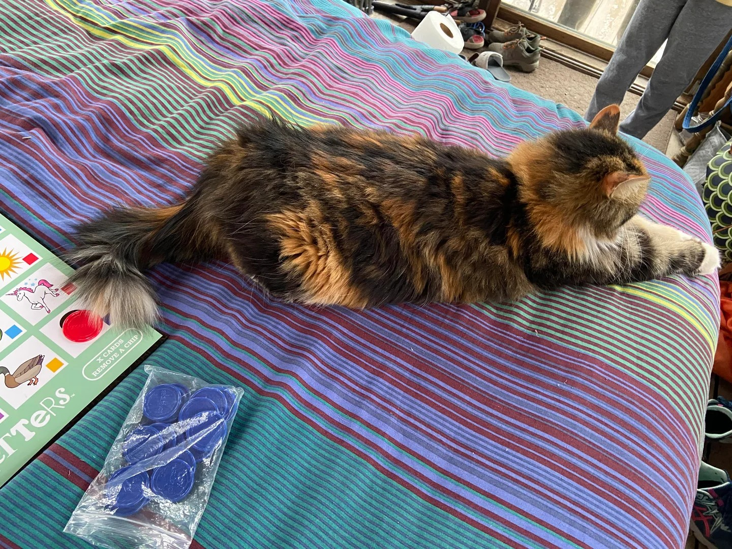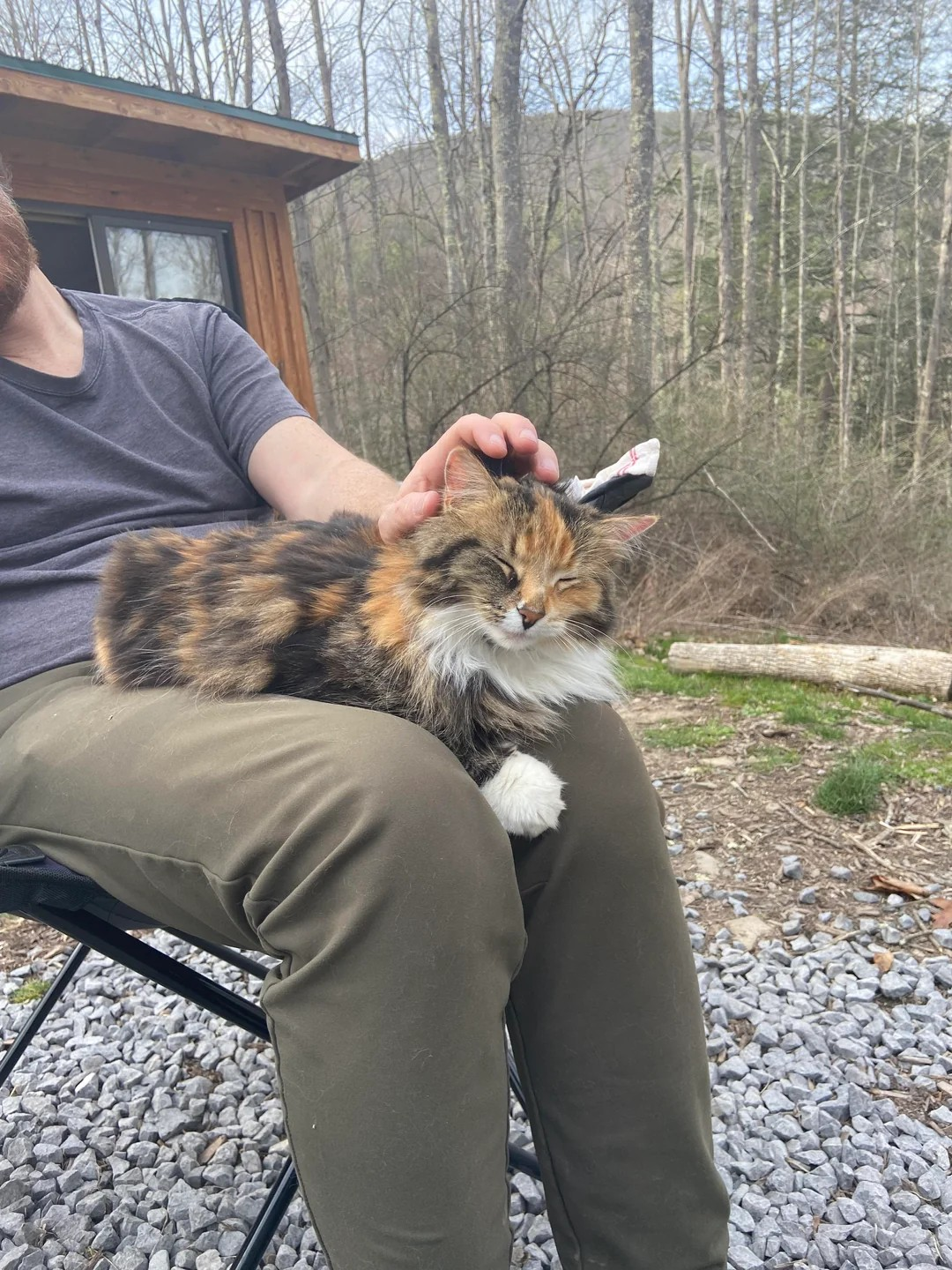 На фото видно ее мужа, сидящего в раскладном кресле возле палатки, а на нем устроилась пушистая трехцветная кошка. Она вела себя так, как будто давно знала эту семью и просто решила отдохнуть с ними.