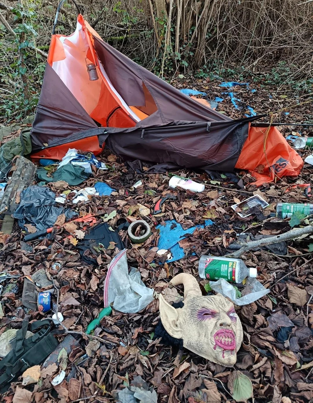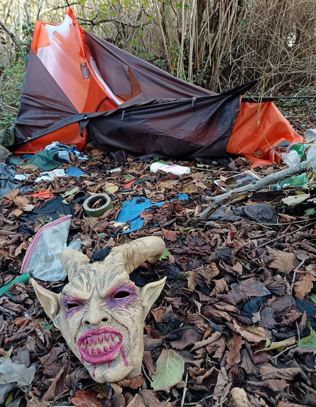 На фото можно увидеть разрушенную палатку, бутылки с жидкостью для розжига, нож, рулон изоленты и гаечный ключ. Однако больше всего всех напугала устрашающая маска с лицом демона.